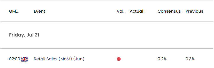 在此之前,预计7月26日的FOMC利率决议可能对英镑/美元产生影响。市场普遍预计美联储将加息25个基点,然而,随着美联储的加息周期看似即将结束,市场参与者可能会更为关注货币政策的前瞻性指引。